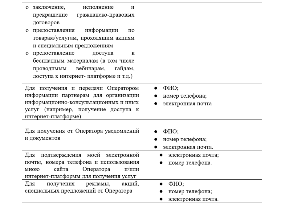 В случае отзыва Согласия Исполнитель вправе продолжить обработку персональных данных без него при наличии оснований, указанных в пунктах 2 – 11 части 1 статьи 6, части 2 статьи 10 и части 2 статьи 11 Федерального закона №152-ФЗ «О персональных данных» от 27.07.2006 г. Дата начала действия согласия – дата проставления галочки.