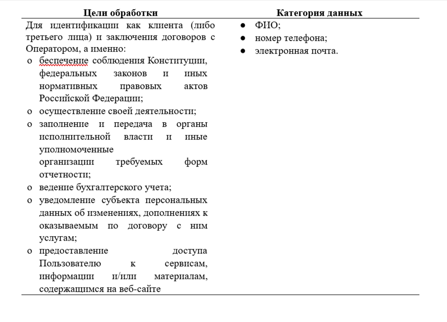 Перечень данных и цель обработки.